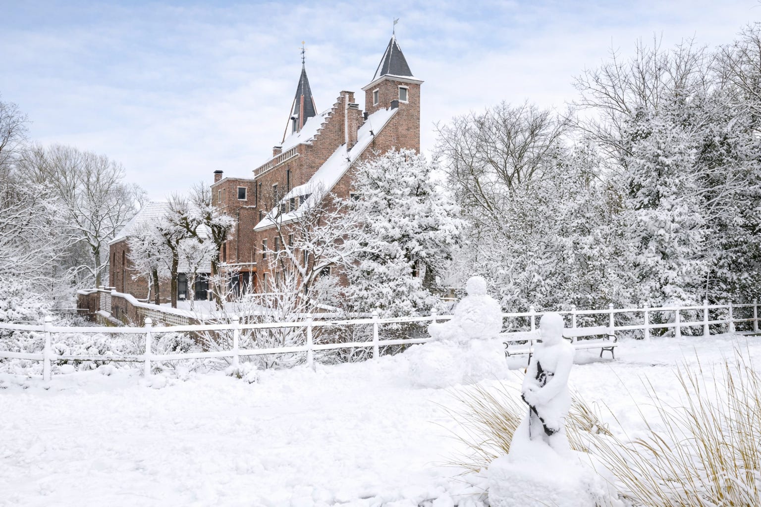 This is the castle at the center of the village. A snowman sits quietly next to the bench, admiring the castle. Witte van Haamstede is in the foreground. He was a knight from about 800 years ago, the only historically notable person this village ever produced. Witte is an old Dutch first name that nobody uses anymore. It means white.